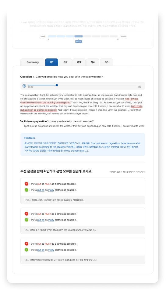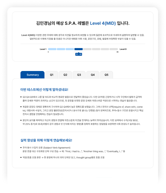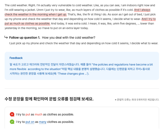 문장 수준의 상세한 피드백과 개선 부분까지 점검할 수 있습니다.